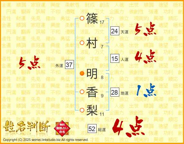 篠(17画)村(7画) 明(8画)香(9画)梨(11画)