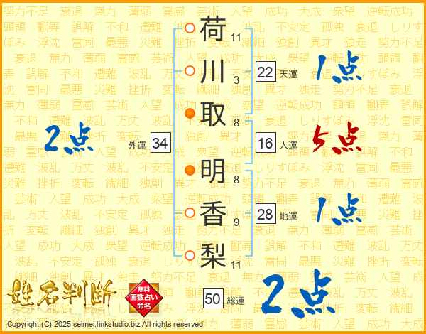 荷(11画)川(3画)取(8画) 明(8画)香(9画)梨(11画)