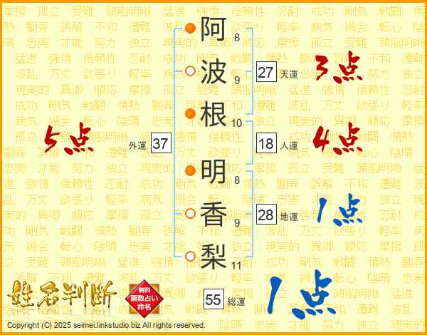 阿(8画)波(9画)根(10画) 明(8画)香(9画)梨(11画)