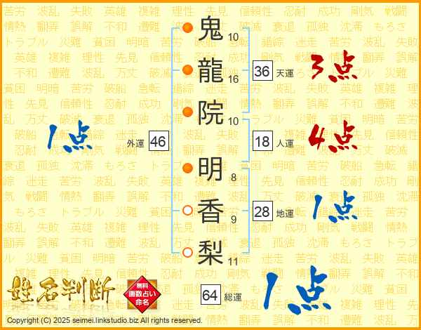 鬼(10画)龍(16画)院(10画) 明(8画)香(9画)梨(11画)