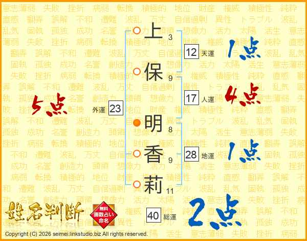 上(3画)保(9画) 明(8画)香(9画)莉(11画)