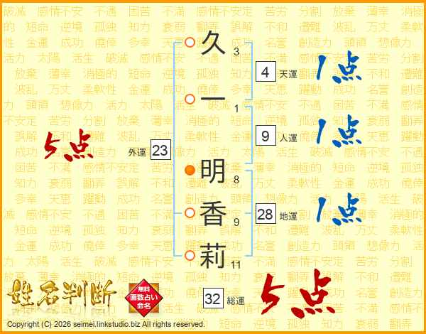 久(3画)一(1画) 明(8画)香(9画)莉(11画)