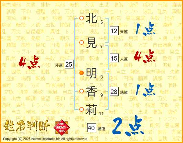北(5画)見(7画) 明(8画)香(9画)莉(11画)
