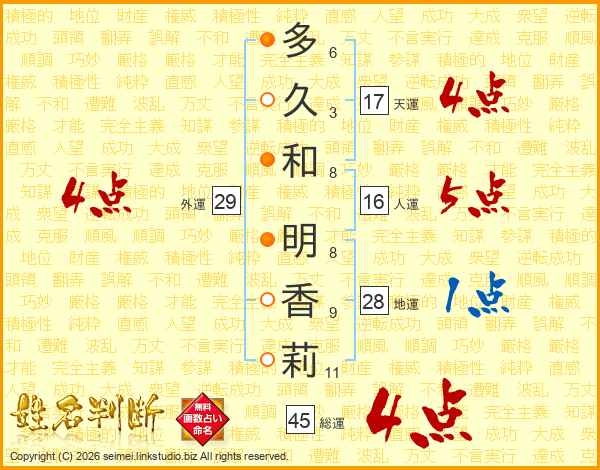 多(6画)久(3画)和(8画) 明(8画)香(9画)莉(11画)