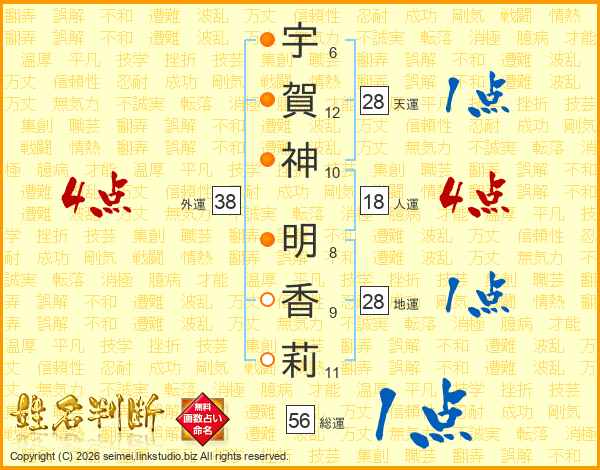 宇(6画)賀(12画)神(10画) 明(8画)香(9画)莉(11画)