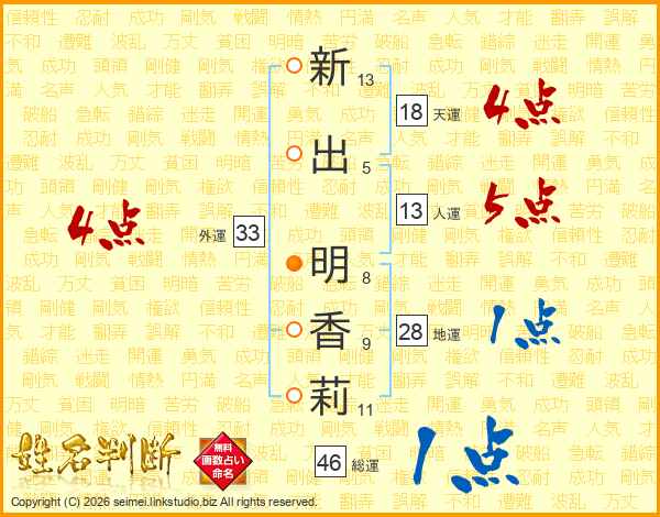 新(13画)出(5画) 明(8画)香(9画)莉(11画)