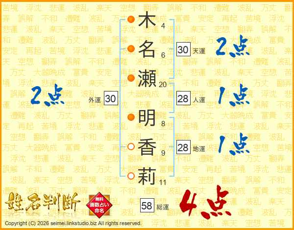 木(4画)名(6画)瀬(20画) 明(8画)香(9画)莉(11画)