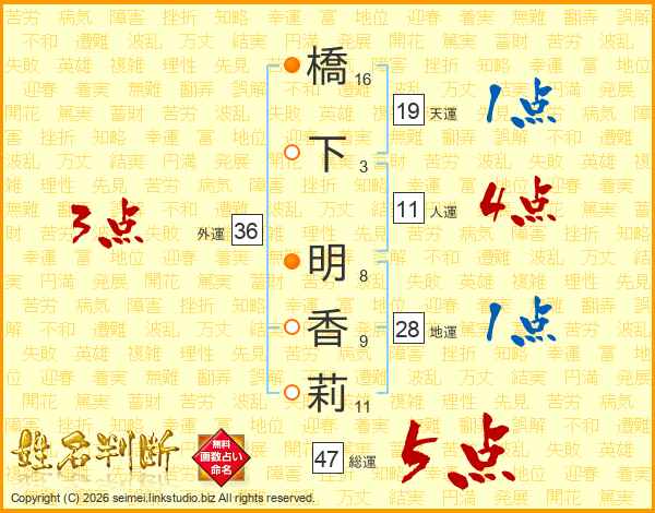 橋(16画)下(3画) 明(8画)香(9画)莉(11画)