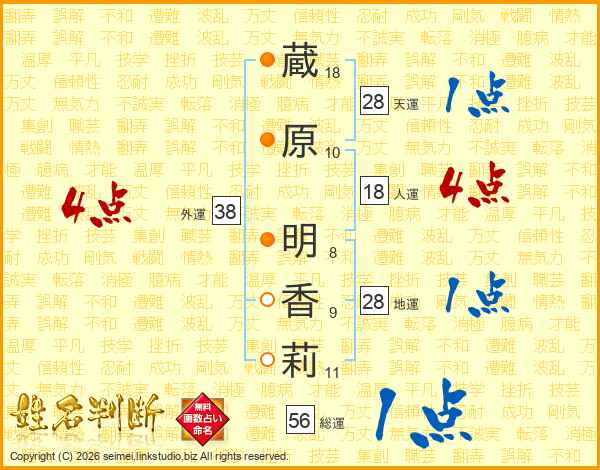 蔵(18画)原(10画) 明(8画)香(9画)莉(11画)