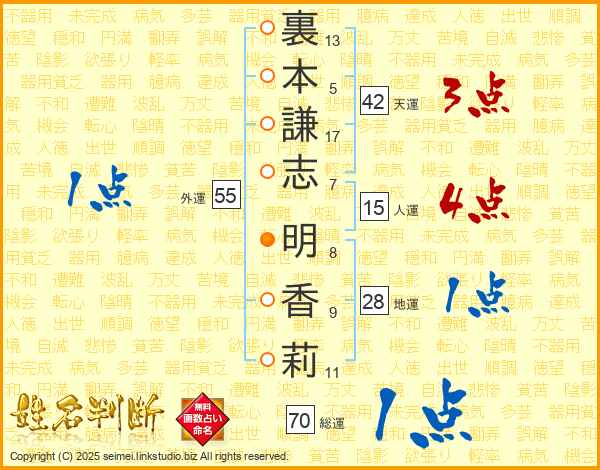 裏(13画)本(5画)謙(17画)志(7画) 明(8画)香(9画)莉(11画)
