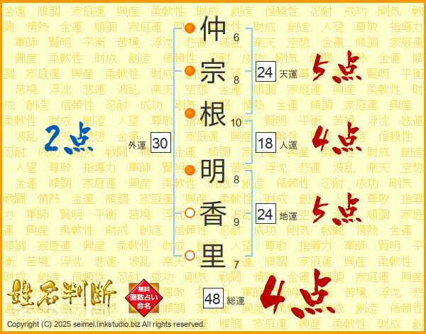 仲(6画)宗(8画)根(10画) 明(8画)香(9画)里(7画)