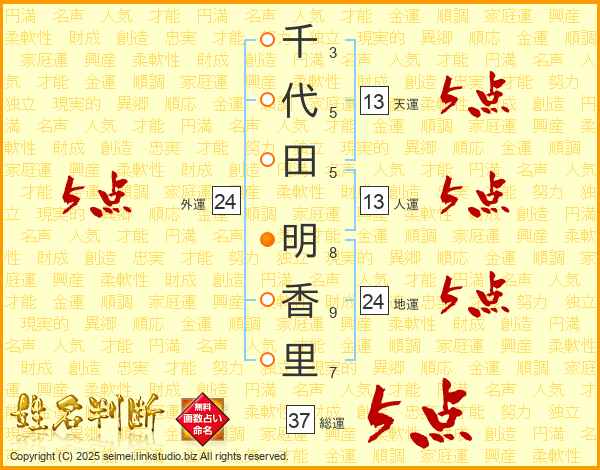 千(3画)代(5画)田(5画) 明(8画)香(9画)里(7画)