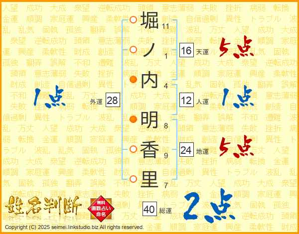 堀(11画)ノ(1画)内(4画) 明(8画)香(9画)里(7画)