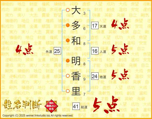 大(3画)多(6画)和(8画) 明(8画)香(9画)里(7画)