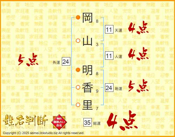 岡(8画)山(3画) 明(8画)香(9画)里(7画)