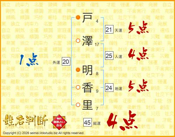 戸(4画)澤(17画) 明(8画)香(9画)里(7画)