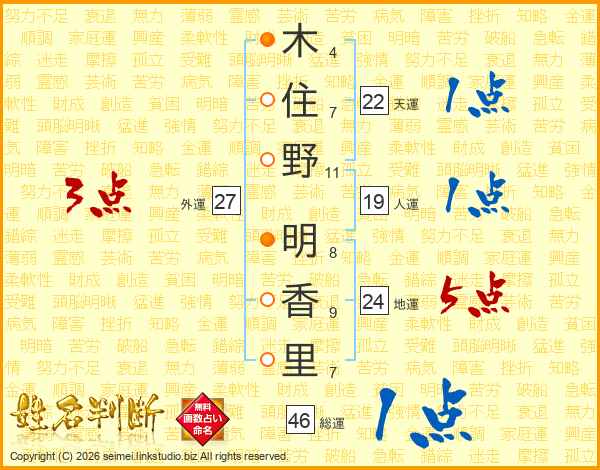 木(4画)住(7画)野(11画) 明(8画)香(9画)里(7画)