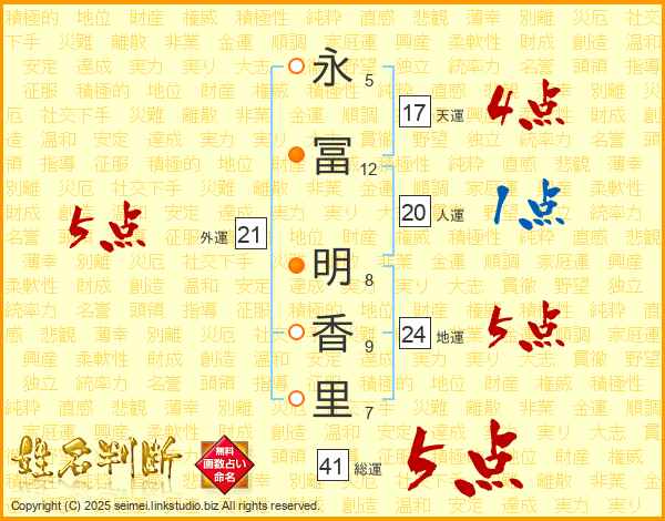 永(5画)冨(12画) 明(8画)香(9画)里(7画)