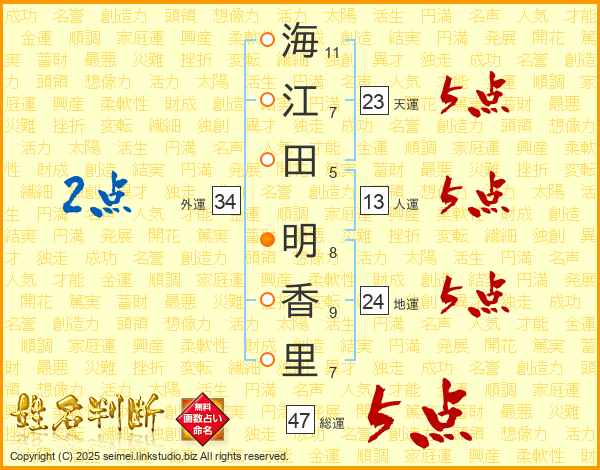海(11画)江(7画)田(5画) 明(8画)香(9画)里(7画)