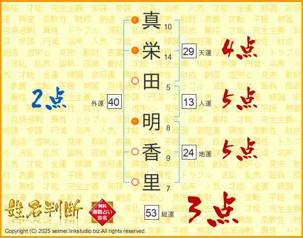 真(10画)栄(14画)田(5画) 明(8画)香(9画)里(7画)