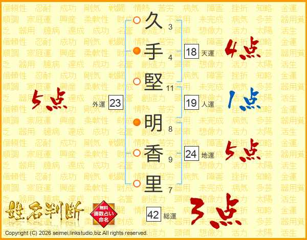 久(3画)手(4画)堅(11画) 明(8画)香(9画)里(7画)
