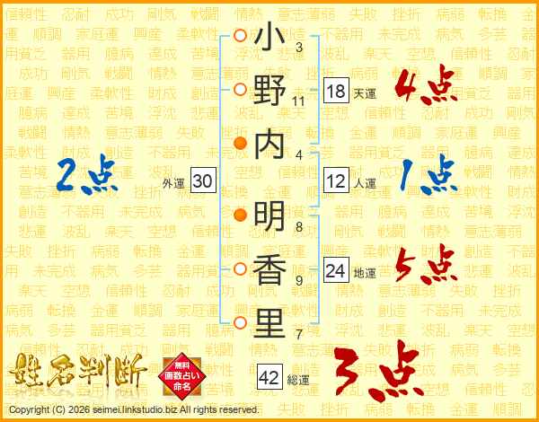 小(3画)野(11画)内(4画) 明(8画)香(9画)里(7画)
