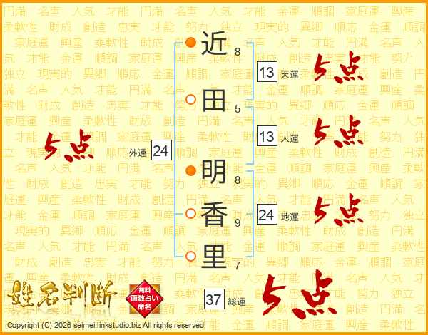近(8画)田(5画) 明(8画)香(9画)里(7画)