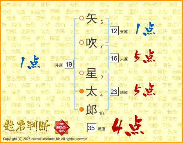 矢(5画)吹(7画) 星(9画)太(4画)郎(10画)