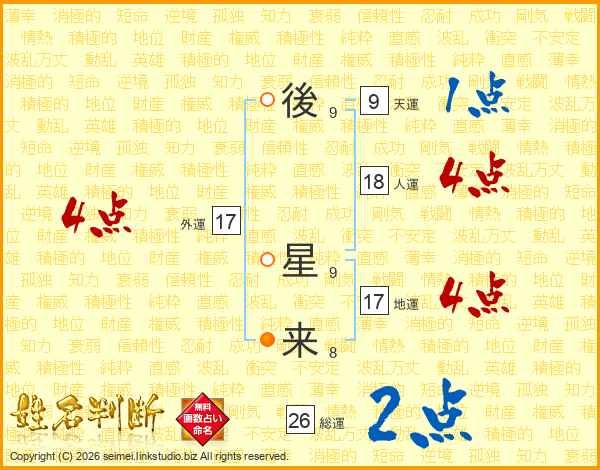 後(9画) 星(9画)来(8画)