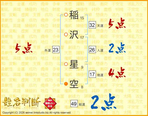 生活面を象徴する運勢です。外部から受ける影響力を表し、結婚運、家庭運や職場、環境への順応性を表します。総運から人運を引いた画数。姓や名が1文字の場合を除く。