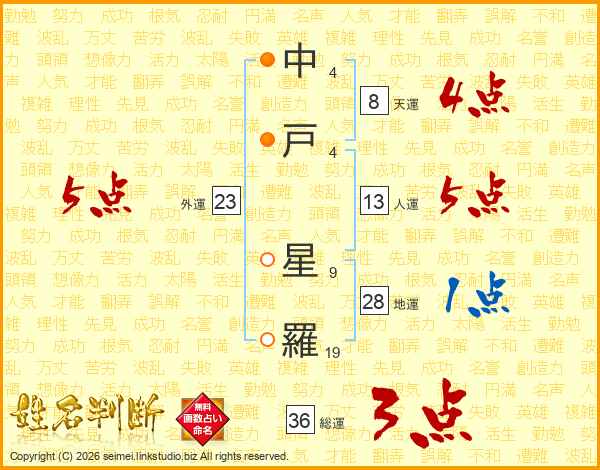 中(4画)戸(4画) 星(9画)羅(19画)