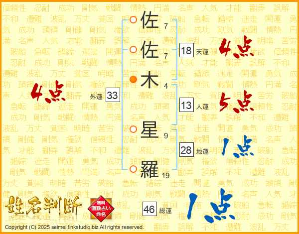 佐(7画)佐(7画)木(4画) 星(9画)羅(19画)