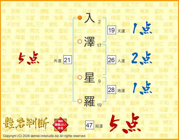 入(2画)澤(17画) 星(9画)羅(19画)