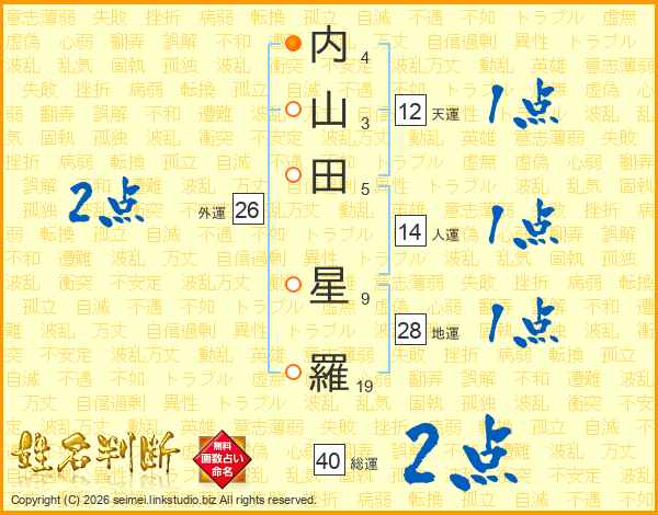 内(4画)山(3画)田(5画) 星(9画)羅(19画)