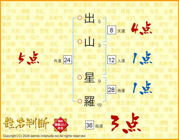 生活面を象徴する運勢です。外部から受ける影響力を表し、結婚運、家庭運や職場、環境への順応性を表します。総運から人運を引いた画数。姓や名が1文字の場合を除く。