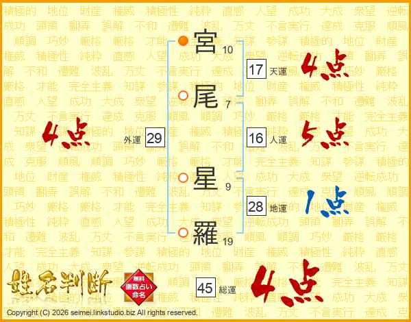宮(10画)尾(7画) 星(9画)羅(19画)