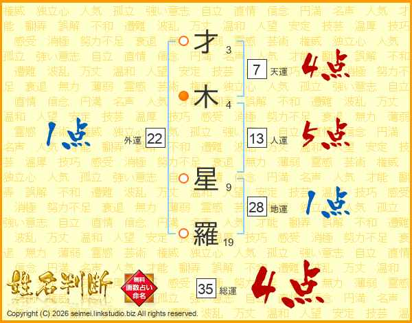 才(3画)木(4画) 星(9画)羅(19画)