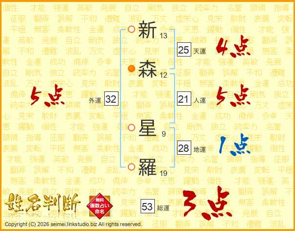 新(13画)森(12画) 星(9画)羅(19画)