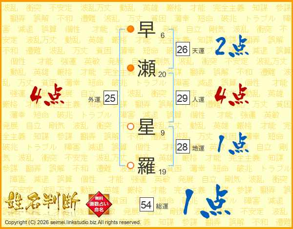 早(6画)瀬(20画) 星(9画)羅(19画)