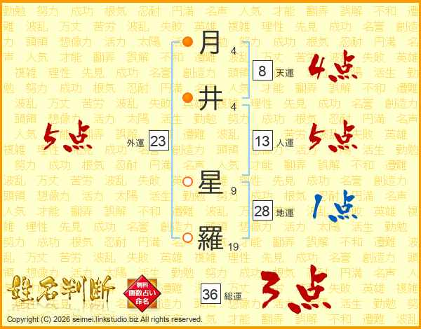 生活面を象徴する運勢です。外部から受ける影響力を表し、結婚運、家庭運や職場、環境への順応性を表します。総運から人運を引いた画数。姓や名が1文字の場合を除く。