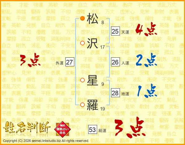 松(8画)沢(17画) 星(9画)羅(19画)