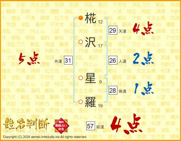 椛(12画)沢(17画) 星(9画)羅(19画)