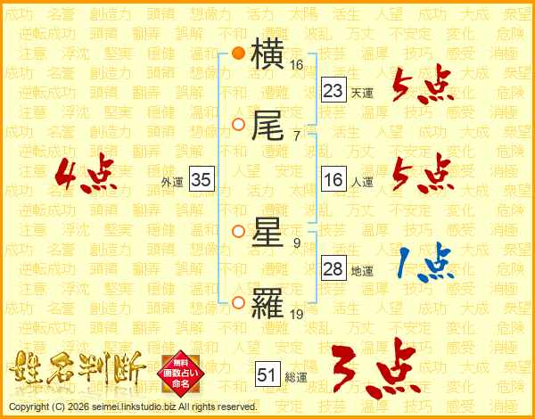 横(16画)尾(7画) 星(9画)羅(19画)