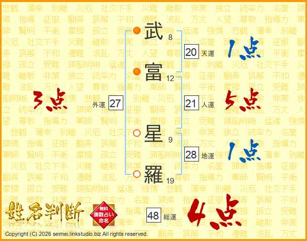 生活面を象徴する運勢です。外部から受ける影響力を表し、結婚運、家庭運や職場、環境への順応性を表します。総運から人運を引いた画数。姓や名が1文字の場合を除く。
