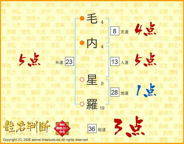 生活面を象徴する運勢です。外部から受ける影響力を表し、結婚運、家庭運や職場、環境への順応性を表します。総運から人運を引いた画数。姓や名が1文字の場合を除く。