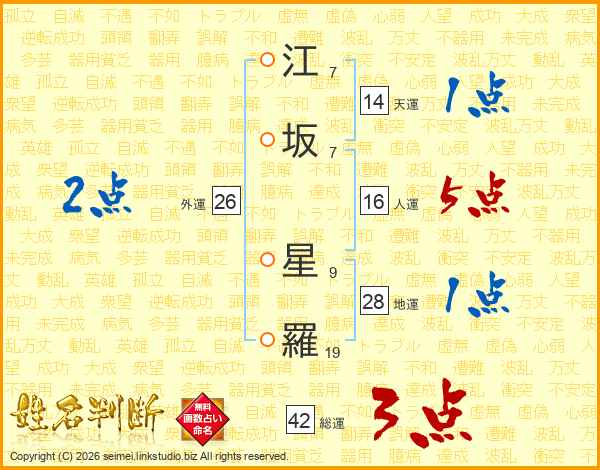 生活面を象徴する運勢です。外部から受ける影響力を表し、結婚運、家庭運や職場、環境への順応性を表します。総運から人運を引いた画数。姓や名が1文字の場合を除く。
