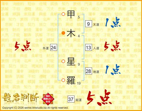 甲(5画)木(4画) 星(9画)羅(19画)