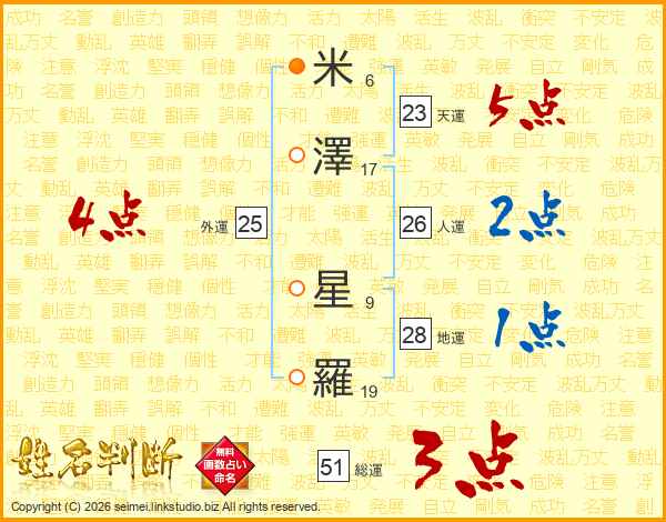 あなたの人生を表す1番重要な運勢です。生涯を通じて影響する総合運となり、主に50歳以降の晩年期に影響を及ぼします。苗字と名前の合計画数。