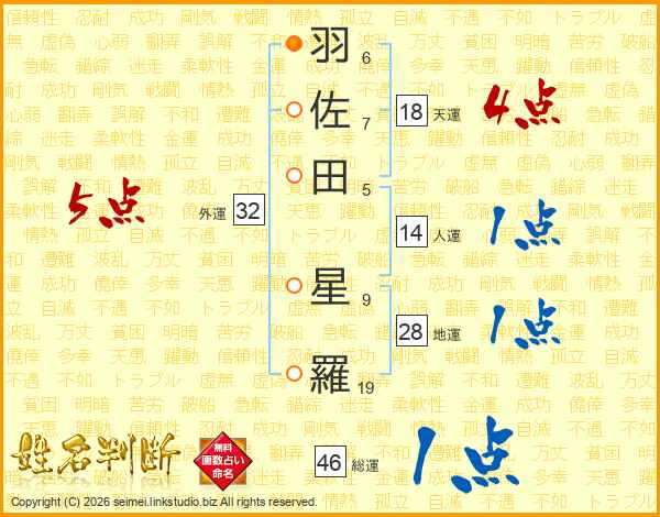 羽(6画)佐(7画)田(5画) 星(9画)羅(19画)