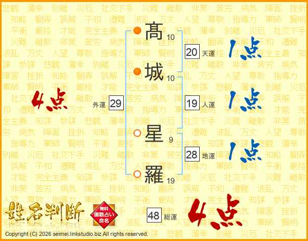 生活面を象徴する運勢です。外部から受ける影響力を表し、結婚運、家庭運や職場、環境への順応性を表します。総運から人運を引いた画数。姓や名が1文字の場合を除く。